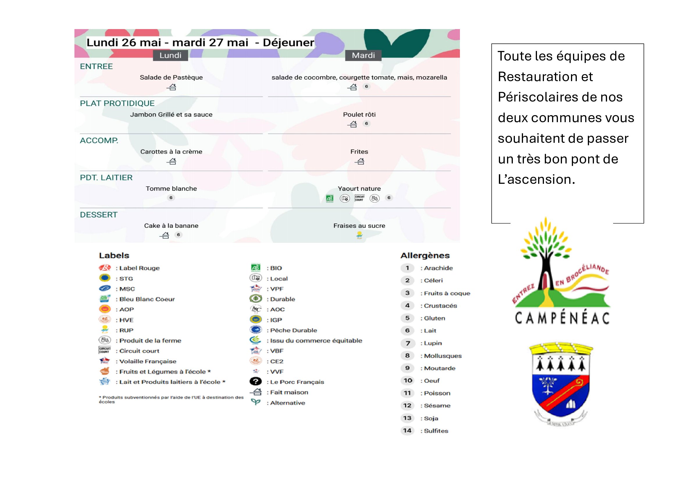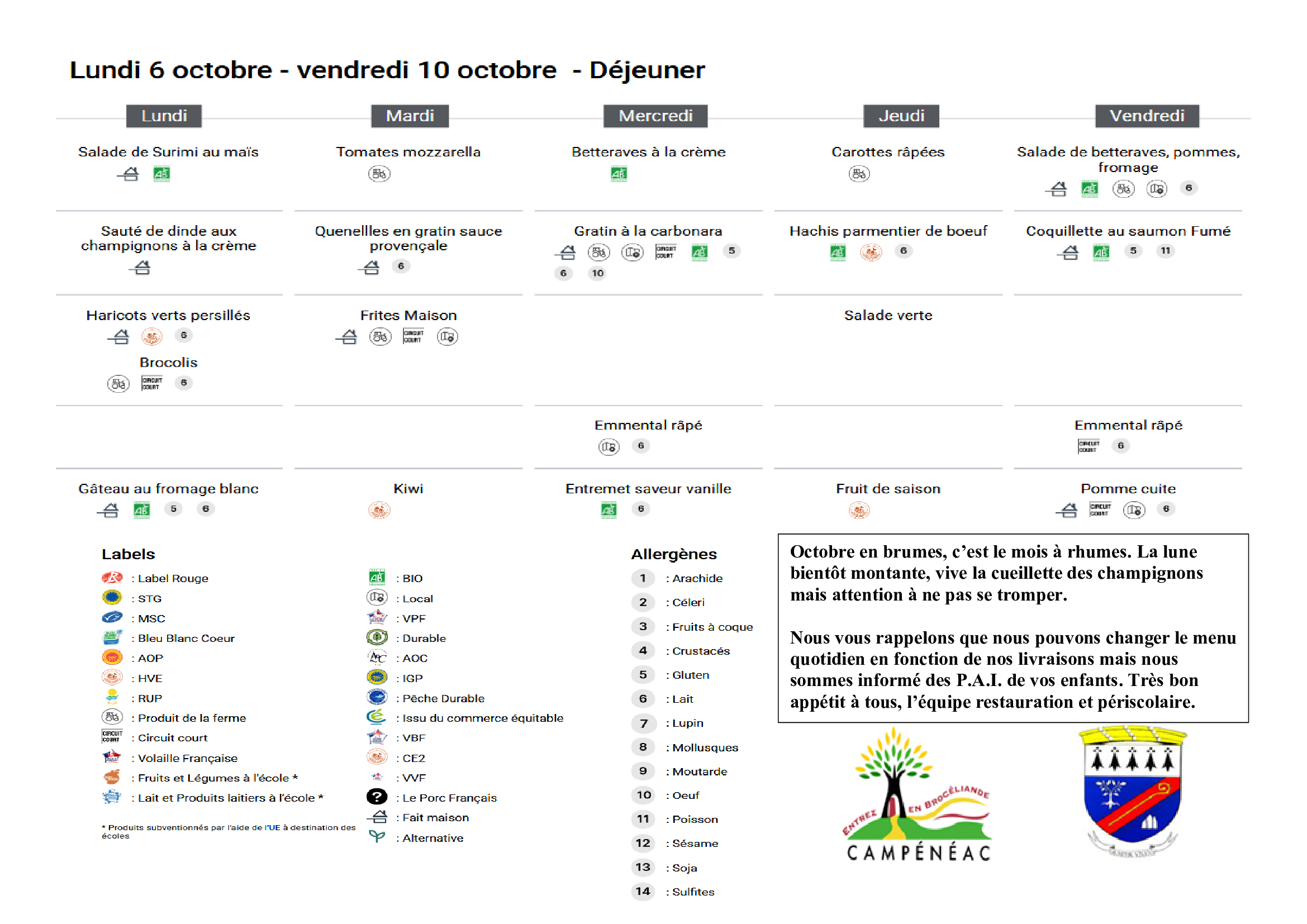 En raison de la rénovation de la salle polyvalente, les repas se font toujours en 2 services mais les enfants mangent dans une seule salle (la salle parquet)